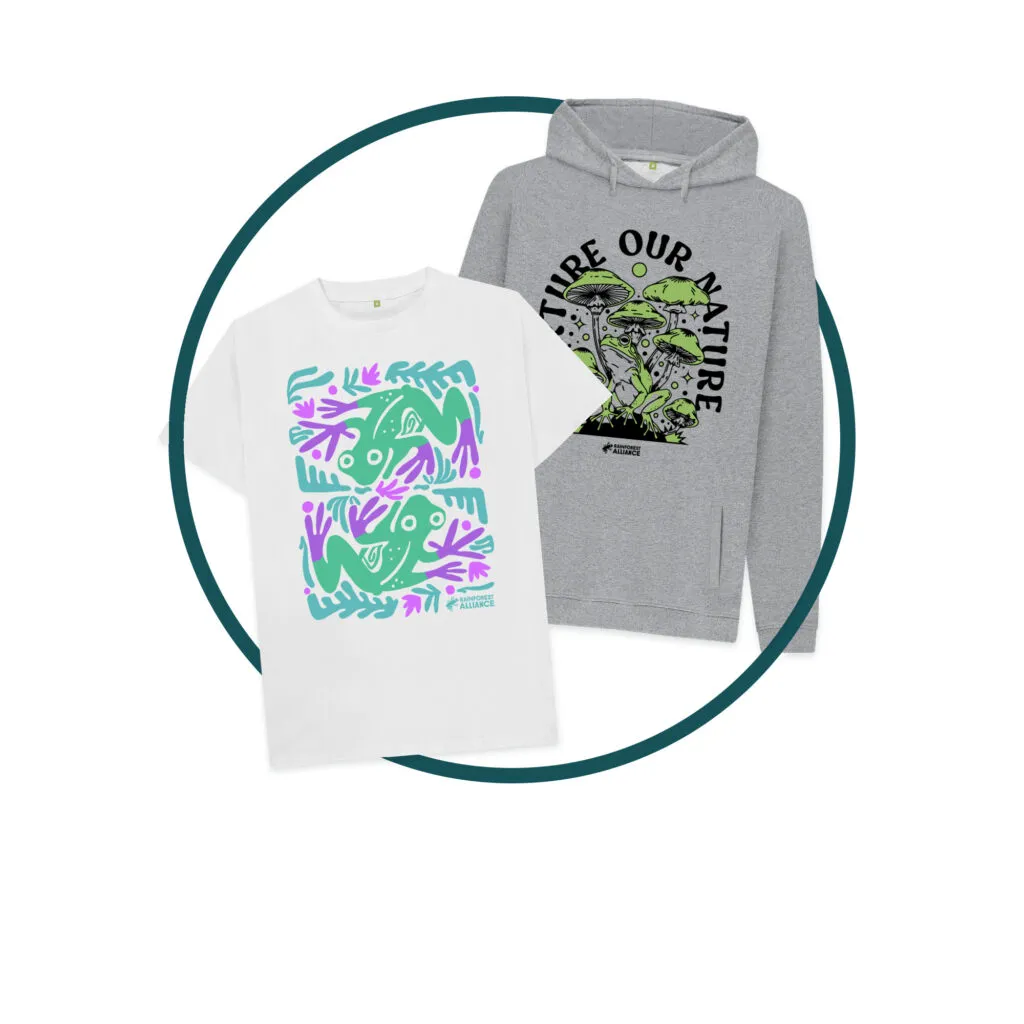 Are you ready to show your support for a better future for people and nature? At the Rainforest Alliance webstore, sustainability and style converge in a carefully curated collection of merchandise featuring our iconic frog. From t-shirts and hoodies to mugs and tea towels, our products embody the harmony of ethical production and environmental responsibility.