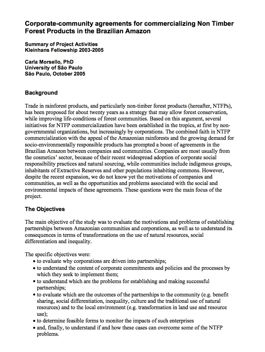 The Universidade de São Paulo in Brazil evaluated the motivations, opportunities, problems, and consequences of trade partnerships or agreements established between forest communities and corporations, for the commercialization of non-timber forest products (NTFPs).