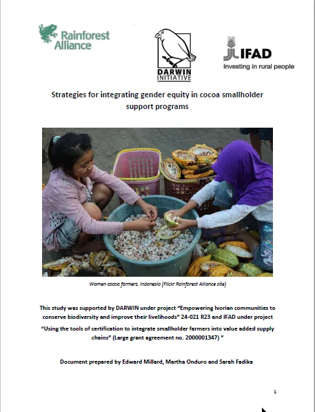 This report outlines the Rainforest Alliance’s approach to mitigate gender inequality in the cocoa sector. It describes current strategies being adopted in the cocoa supply chain by the Rainforest Alliance and draws on lessons to improve positive impact on women. Examples are given of work in the three IFAD cocoa project sites.