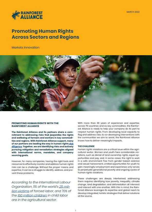 For many companies, having the right tools and resources to effectively monitor and address human rights risks can be a challenge. Without the proper means and expertise, it can be a struggle to identify, address, and prevent these problems. With more than 30 years of experience and expertise, across 70 countries and six key commodities, the Rainforest Alliance is ready to help your company do its part to respect human rights. From developing local capacity to flag and address risks, to co-developing interventions with the communities we aim to assist, the Rainforest Alliance knows how to deliver meaningful impacts.