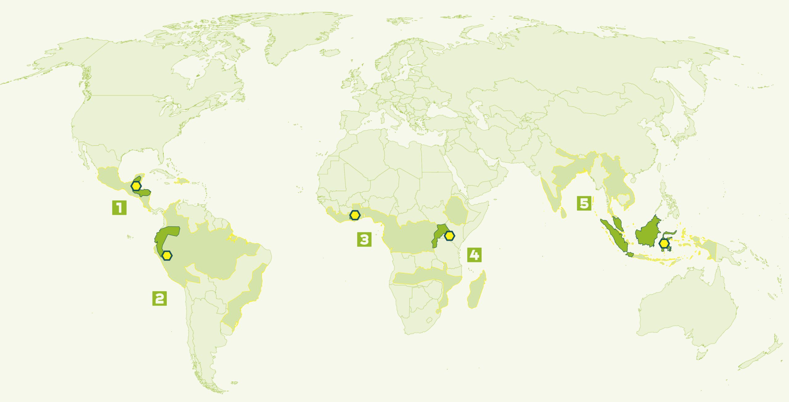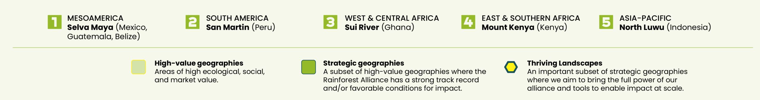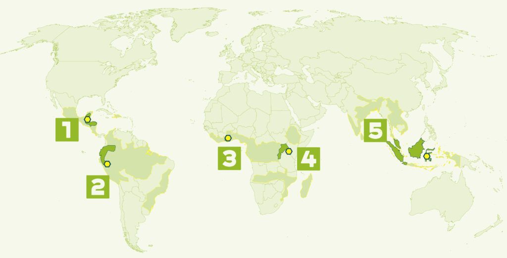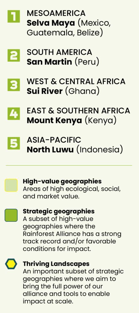 From the dense forest belts of Mount Kenya to the sprawling canopy of the Selva Maya, protecting the world’s most iconic—and threatened—landscapes is central to our work at the Rainforest Alliance. To make the greatest impact, we focus our efforts on five key production landscapes.