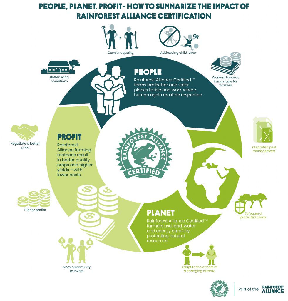 As we face increasing environmental and social challenges, savvy consumers are demanding more of companies. They want proof of how companies are contributing to a healthier and more sustainable world. Rainforest Alliance certification benefits your company by offering a powerful way to demonstrate your sustainability commitments. Through certification, companies also gain rewards from establishing better business practices for both people and nature.