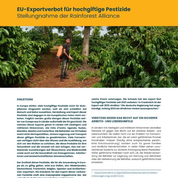 Eine Zertifizierung durch die Rainforest Alliance schränkt den Einsatz von Pflanzenschutzmitteln erheblich ein. Unser Standard für Nachhaltige Landwirtschaft verbietet die aggressivsten Chemikalien. Stattdessen fördern wir natürliche Schädlingsbekämpfung als oberste Schädlingsabwehr. In Fällen, in denen nur durch Schädlingsbekämpfungsmittel das Überleben der Nutzpflanzen gewährleistet werden kann, fordern unsere Standards von den Betrieben den Einsatz von Mitteln geringer Toxizität. Zusätzlich bieten wir ArbeiterInnen umfassende Sicherheitsunterweisungen, stellen Schutzkleidung und Waschstationen. Einer unabhängigen Studie der Universität Wageningen aus dem Jahr 2019 zufolge waren ArbeiterInnen auf Rainforest Alliance-zertifizierten Bananenfarmen eher bereit ihre gesamte Schutzausrüstung zu tragen als ArbeiterInnen nicht zertifizierter Betriebe.