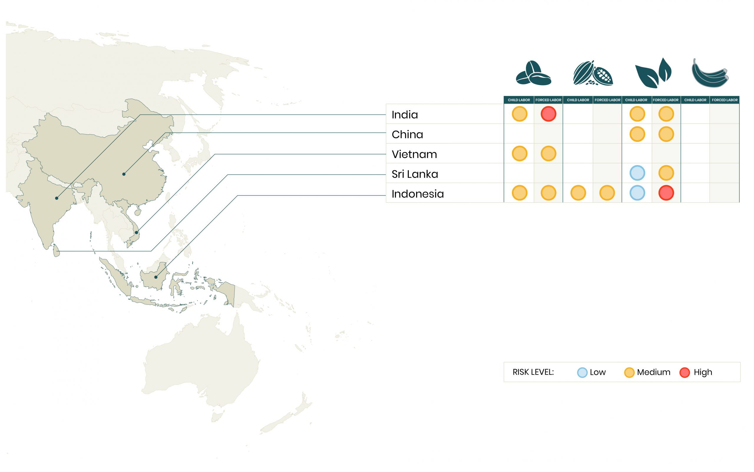 Hinweis: Diese Risikokarten stellen Risiken auf Länderebene dar und nicht auf regionaler Ebene oder nur für bestimmte ErzeugerInnen. Sie stützen sich teilweise auf Daten, die von Dritten zur Verfügung gestellt wurden, und werden fortlaufend überprüft und verfeinert. Der Zweck dieser Risikokarten ist, Maßnahmen zur Risikominderung an den jeweiligen Kontext anzupassen und Anforderungen und Kontrollmaßnahmen je nach Risikostufe anzugleichen. Die Risikokarten zeigen nicht an, ob in einem Land die angegebenen Probleme bestehen oder nicht. Ebenso sind sie nicht als Grundlage für Beschaffungsentscheidungen oder andere Zwecke gedacht.