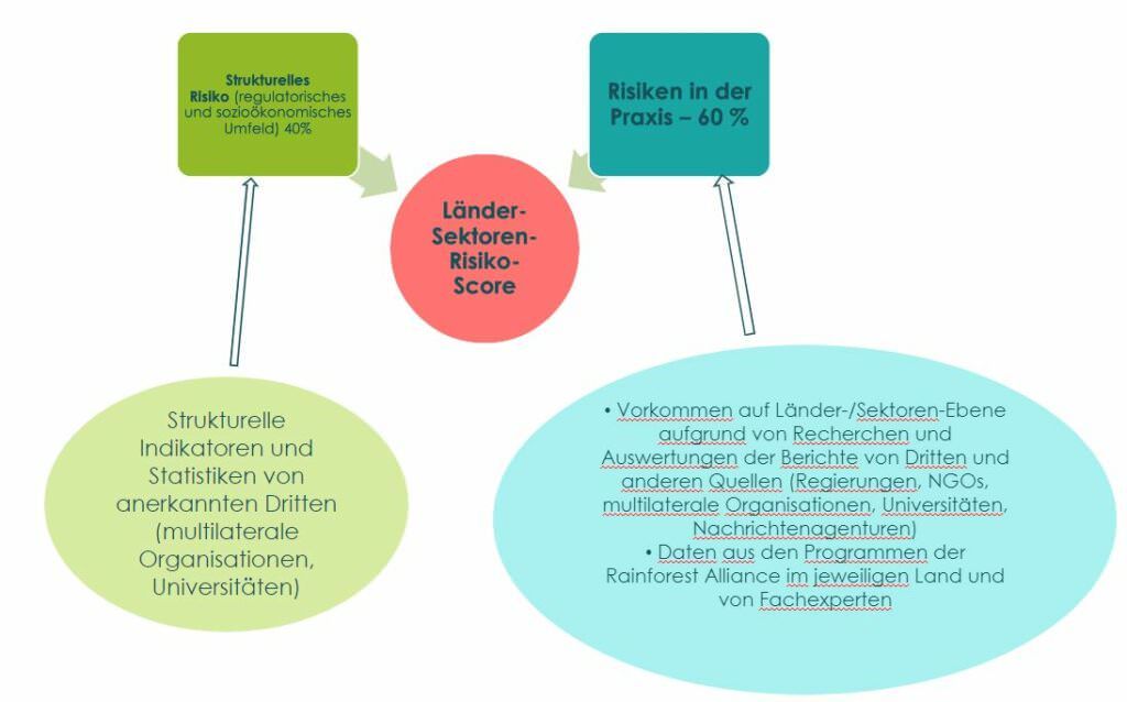 - „Risiken in der Praxis“, Indikatoren, die spezifisch für den jeweiligen Sektor in jedem Land sind. Diese Indikatoren beruhen auf Forschungsberichten von Regierungen, NGOs, multilateralen Organisationen, Universitäten, Nachrichtenagenturen und den eigenen Daten der Rainforest Alliance. Diese machen 60 % des Risiko-Scores aus.