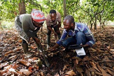 Neben dem Ausbau bestehender digitaler Programme haben wir ebenfalls neue Initiativen gestartet, um die ErzeugerInnen auf ihrem Weg zu mehr Nachhaltigkeit zu unterstützen. Im Rahmen unserer FarmGrow-Initiative haben wir beispielsweise individuelle Sieben-Jahres-Pläne entwickelt – alle mobil zugänglich – die die Erträge der teilnehmenden ghanaischen KakaofarmerInnen bis auf das Dreifache steigern könnten. Die Pläne verwenden Piktogramme (um den verschiedenen Alphabetisierungsgraden Rechnung zu tragen), die ErzeugerInnen bei der Umsetzung von Best Practices unterstützen und die Gesundheit der Böden fördern sowie deren Klimabeständigkeit erhöhen, wie zum Beispiel durch das Beschneiden und Neuanpflanzen von Bäumen.
