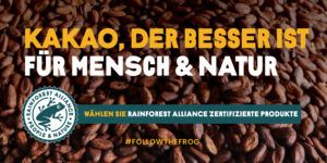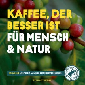 Das Rainforest Alliance-Zertifizierungssiegel bedeutet, dass das Produkt (oder ein bestimmter Inhaltsstoff) von land- und forstwirtschaftlichen ErzeugerInnen und/oder Unternehmen hergestellt wurde, die zusammenarbeiten, um eine Welt zu schaffen, in der Mensch und Natur gemeinsam wachsen.