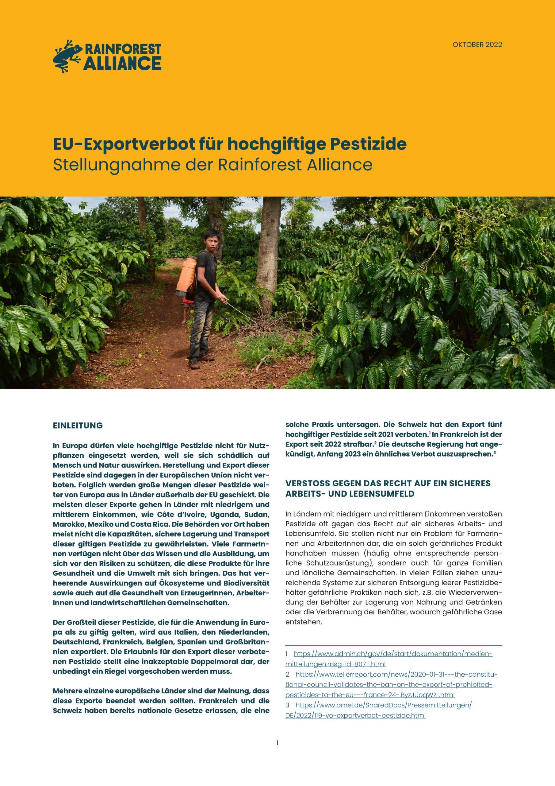 Die Erlaubnis für den Export dieser verbotenen Pestizide stellt eine inakzeptable Doppelmoral dar, der unbedingt ein Riegel vorgeschoben werden muss. Die Rainforest Alliance ruft die EU auf, ein solches Verbot schnellstmöglich zu erlassen und umzusetzen und dabei sicherzustellen, dass ErzeugerInnen – vor allem KleinbäuerInnen – bei der Umstellung unterstützt werden, indem sie Zugang zu Schulungen sowie zu Alternativen zu hochgiftigen Pestiziden erhalten