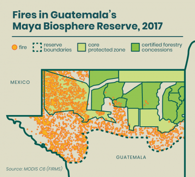 Esta estrategia, denominada silvicultura comunitaria, se basa en la idea de que quienes viven del bosque tienen más incentivos para protegerlo. ¿Resulta factible la silvicultura comunitaria como estrategia de conservación? Expresado de otro modo: La tasa de deforestación de las nueve concesiones originales y activas ha sido virtualmente nula durante 20 años, una hazaña más que notable si recordamos que las zonas directamente adyacentes registran habitualmente uno de los índices de deforestación más elevados de América. De hecho, el esfuerzo de protección realizado por estas concesiones ha resultado mucho más fructífero que la mayor parte de las unidades de la RBM dirigidas rigurosamente a la protección. El Parque Nacional Laguna del Tigre de la RBM, por ejemplo, ha experimentado una preocupante deforestación debido a las explotaciones ganaderas a gran escala, muchas de las cuales están vinculadas al narcotráfico y al crimen organizado. Además, solo el 2 % del número total de incendios padecidos por la reserva suceden en las comunidades.