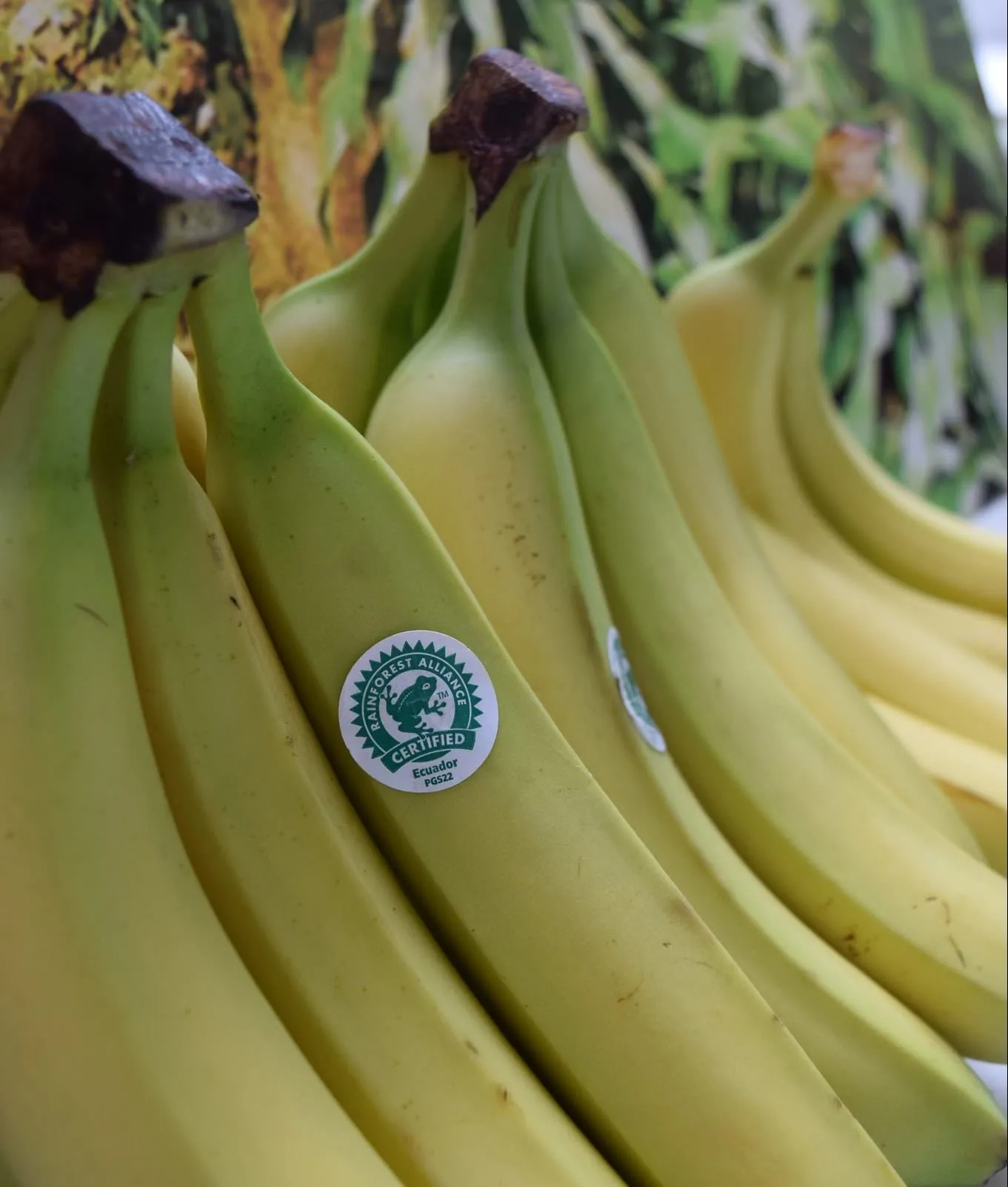 Fotos de fincas bananeras certificadas por Rainforest Alliance y productores de banano. También incluye gráficos para redes sociales que se pueden compartir.