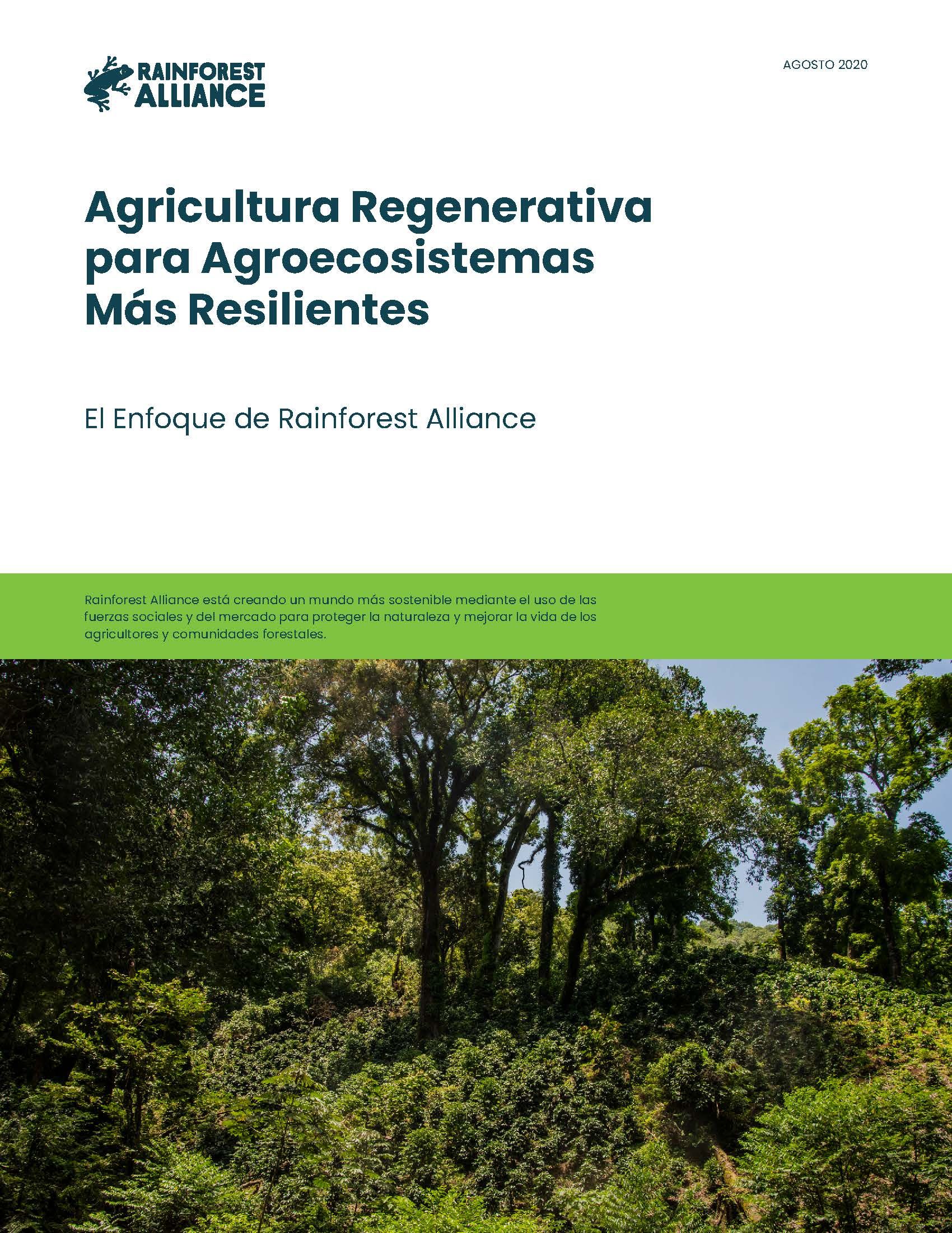 Para Rainforest Alliance, la “agricultura regenerativa” comprende una amplia gama de principios y prácticas bajo el concepto de “agricultura climáticamente inteligente”. La agricultura regenerativa pretende aumentar la biodiversidad, mejorar los servicios ecosistémicos y aumentar la resiliencia del sistema agroecológico por medio de un enfoque agroecológico y de manejo integrado de sistemas para crear medios de vida resilientes. Esta forma de llevar los cultivos se basa en potenciar los puntos fuertes de los agroecosistemas, lo que permite, en última instancia, reducir los insumos externos (fertilizantes y pesticidas sintéticos) y aumentar los ingresos netos de las fincas al reducir los costos.