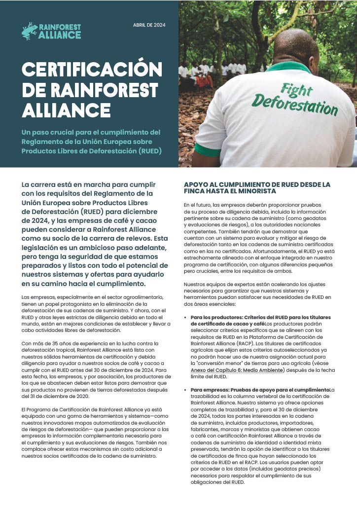La carrera está en marcha para cumplir con los requisitos del Reglamento de la Unión Europea sobre Productos Libres de Deforestación (RUED) para diciembre de 2024, y las empresas de café y cacao pueden considerar a Rainforest Alliance como su socio de la carrera de relevos