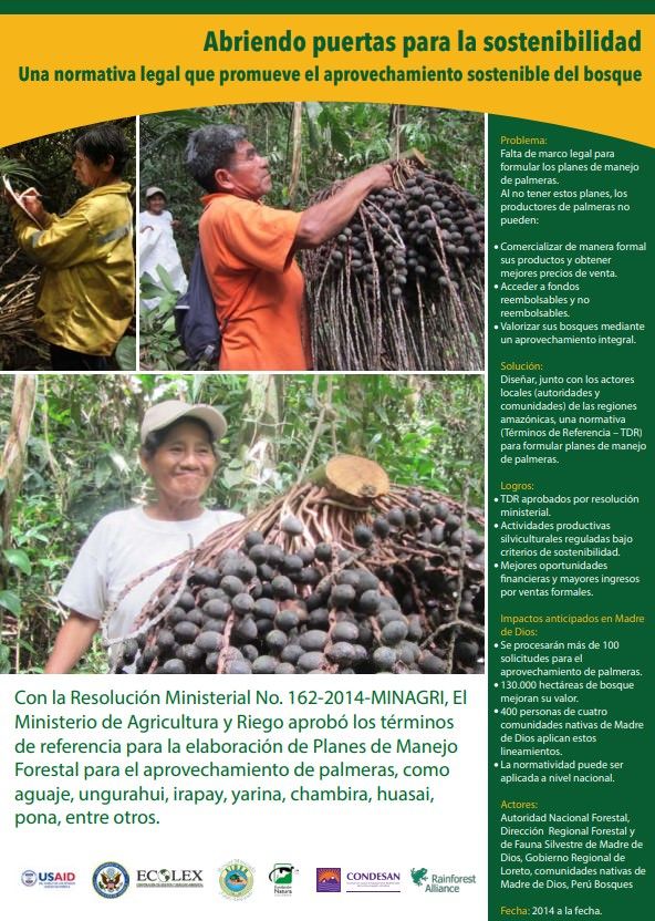 Rainforest Alliance impulsó el diseño y aprobación de una normativa legal que promueve el aprovechamiento sostenible del bosque, permitiendo que más de 30 comunidades en Perú puedan mejorar sus ingresos económicos y que 130 hectáreas aumenten su valor. El apoyo se dio en el marco de la Iniciativa para la Conservación en la Amazonia Andina, financiada por USAID.