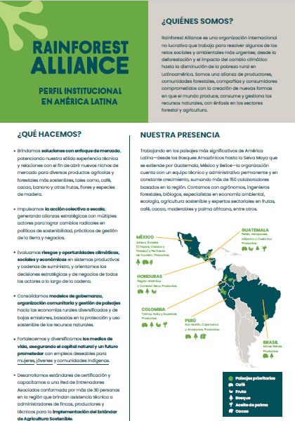 Trabajando a través de los paisajes naturales más importantes de América Latina, desde la selva amazónica sudamericana hasta la selva maya que se extiende a través de Guatemala, México y Belice, Rainforest Alliance tiene una presencia permanente, con un creciente equipo técnico y administrativo que incluye a más de 150 miembros del personal con sede en la región. Conozca más sobre cómo trabajamos juntos en diferentes áreas y en colaboración con muchos actores para lograr un mayor impacto en esta región.