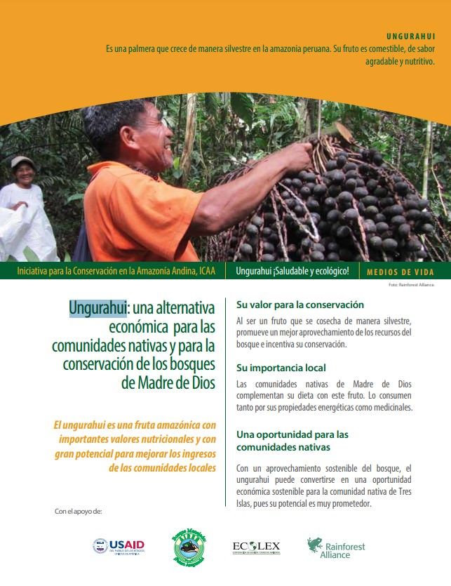 La cosecha de ungurahi es una alternativa económica para las comunidades nativas y para la conservación de los bosques de Madre de Dios, en Perú. Tiene importantes valores nutricionales y un gran potencial para mejorar los ingresos de los pobladores. Rainforest Alliance, con el apoyo de la Agencia de los Estados Unidos para el Desarrollo Internacional (USAID) y del Banco Interamericano de Desarrollo (BID), respalda a estas comunidades para generar valor agregado al ungurahui y así mejorar sus ingresos.