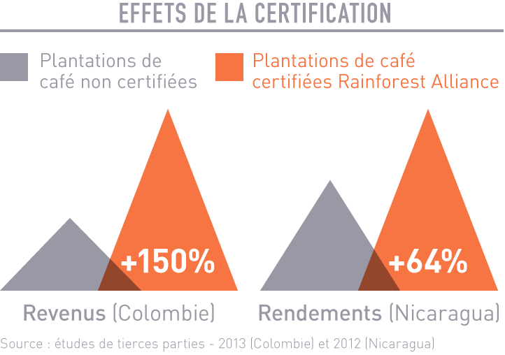 La certification vise à aider les caféiculteurs à améliorer leur productivité et leur rentabilité en utilisant des méthodes plus durables et une meilleure gestion des exploitations agricoles. L’application d’engrais avec plus de précision, en utilisant des méthodes telles que l’échantillonnage des sols, peut réduire les émissions d’azote et améliorer la santé des sols tout en améliorant en même temps les rendements et les revenus. La diversification des sources de revenus peut aider elle aussi. Trois études1 publiées au cours des cinq dernières années montrent que les revenus provenant de la production de café sur les petites exploitations agricoles certifiées d’Afrique de l’Est sont 179 pour cent plus élevés en moyenne que pour les exploitations agricoles non certifiées.