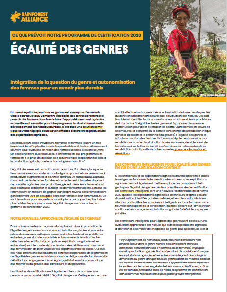 Les entreprises sont les plus à même de veiller à ce que l’égalité des femmes constitue un pilier de leur approche responsable. Prenons l’exemple de notre travail avec Unilever et Cargill pour sensibiliser davantage les formateurs et coopératives agricoles à la question des droits des femmes. Nous avons distribué aux formateurs de chez Cargill divers outils sur le genre avant de les former à les utiliser correctement pour qu’ils puissent mieux aider les coopératives à traiter les problématiques liées au genre dans le cadre de notre programme de certification. Par conséquent, les formateurs étaient beaucoup plus sensibilisés sur ces questions et ont été en mesure de mieux aider les exploitants et ouvriers agricoles à comprendre l’importance de pratiques plus équitables au sein de leurs coopératives. S’inscrivant dans les exigences de notre norme, les formateurs ont par la suite guidé les coopérative dans leur élaboration de comités pour le genre ou dans la nomination d’un représentant pour des pratiques responsables, chargé de sensibiliser et résoudre les problématiques liées au genre parmi les membres de la coopérative et leurs familles.