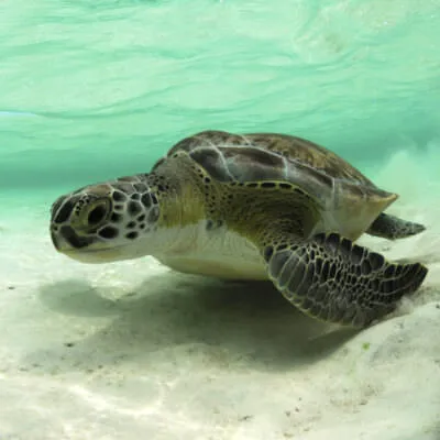 The range of the green sea turtles extends through most tropical and subtropical oceans in the world. The Gulf of Mexico and the Caribbean Sea is home to the Atlantic subpopulation – where they live in shallow waters and travel through costal inlets, bays, and estuaries.