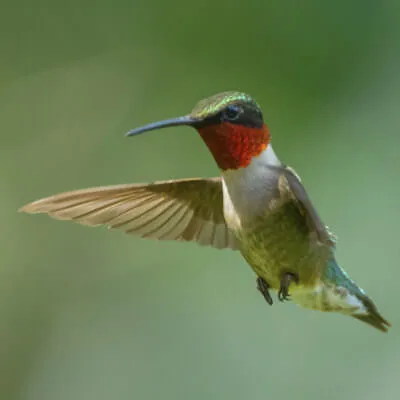 The ruby-throated hummingbird is among the smallest of the North American hummingbirds, measuring just three to 3.75 inches in length from beak to tail with a wingspan of four to 4.75 inches. These tiny birds weigh only 0.1 ounce and males are typically smaller than the females. Both males and females are a metallic bronze-green color on their crown, nape, back and middle two tail feathers. Males typically have green sides while females have brownish sides, and the wings and outer tail feathers of both sexes are dark, with a hint of purple. The female’s tail is rounded and has white on the tips of the outer feathers, while the male’s tail does not have this white coloration and is slightly notched. Males can be easily distinguished from females because of their brilliant, iridescent red throats, which seen from the side may appear golden, greenish, or even dark. The chin and side of the male’s head below the eyes is black, while the female’s chin is white. The young of both sexes look like the adult female.