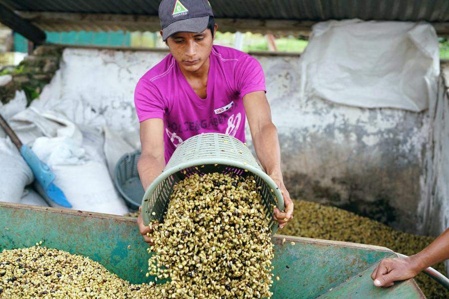 In the late afternoon, after the rain, bags of newly picked cherries are weighed, so workers may be paid accordingly. The cherries are poured into a trough, then move through a maze of water channels for cleaning; they are then separated by density, which determines the quality of the coffee. Here a worker at the Finca El Platanillo wet mill scoops beans ready for drying. Another worker will lay out the beans in a thin layer across a concrete slab to continue the drying process.