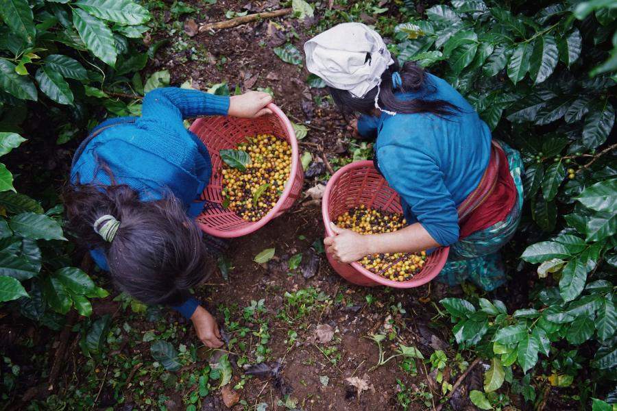 Two pickers collect fallen cherries off the ground. While most coffee varieties turn red when ripe, this varietal produces yellowish cherries.
