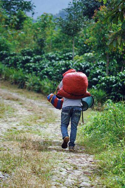 A picker hauls a bag of ripe coffee cherries to the farm’s wet mill to be weighed, recorded, and sorted by bean quality. Workers may also leave their bags by the side of the road to be picked up by a truck later in the day.