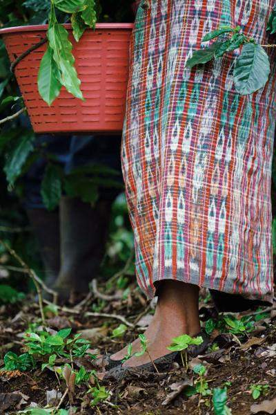 A coffee picker wearing a corte, a traditional Maya skirt.