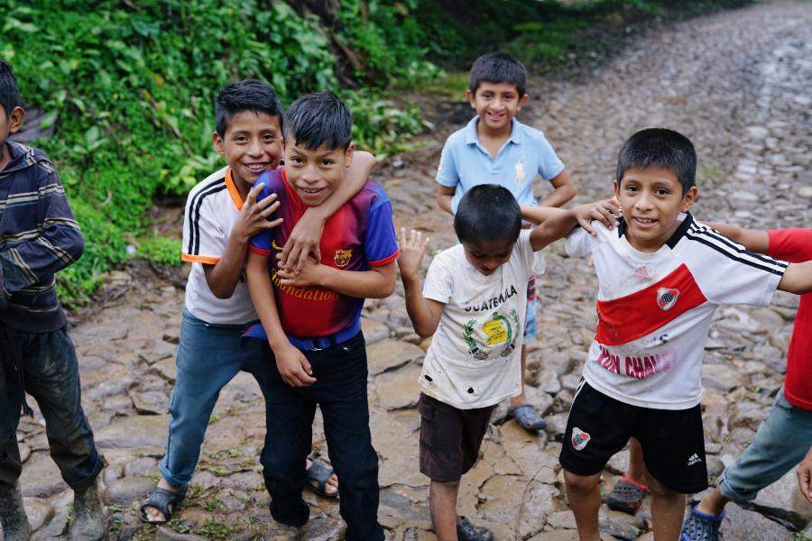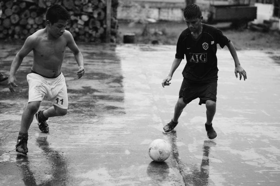 Worker housing opens onto a communal patio that also serves as a basketball court and soccer field. Here some teenagers play a quick game of soccer in the aftermath of an afternoon downpour. Cross says that while the harvest makes for an intense schedule—pickers are in the field by sun-up, so they can finish at noon when the rains begin—they are home in the afternoon and evening to enjoy their families.