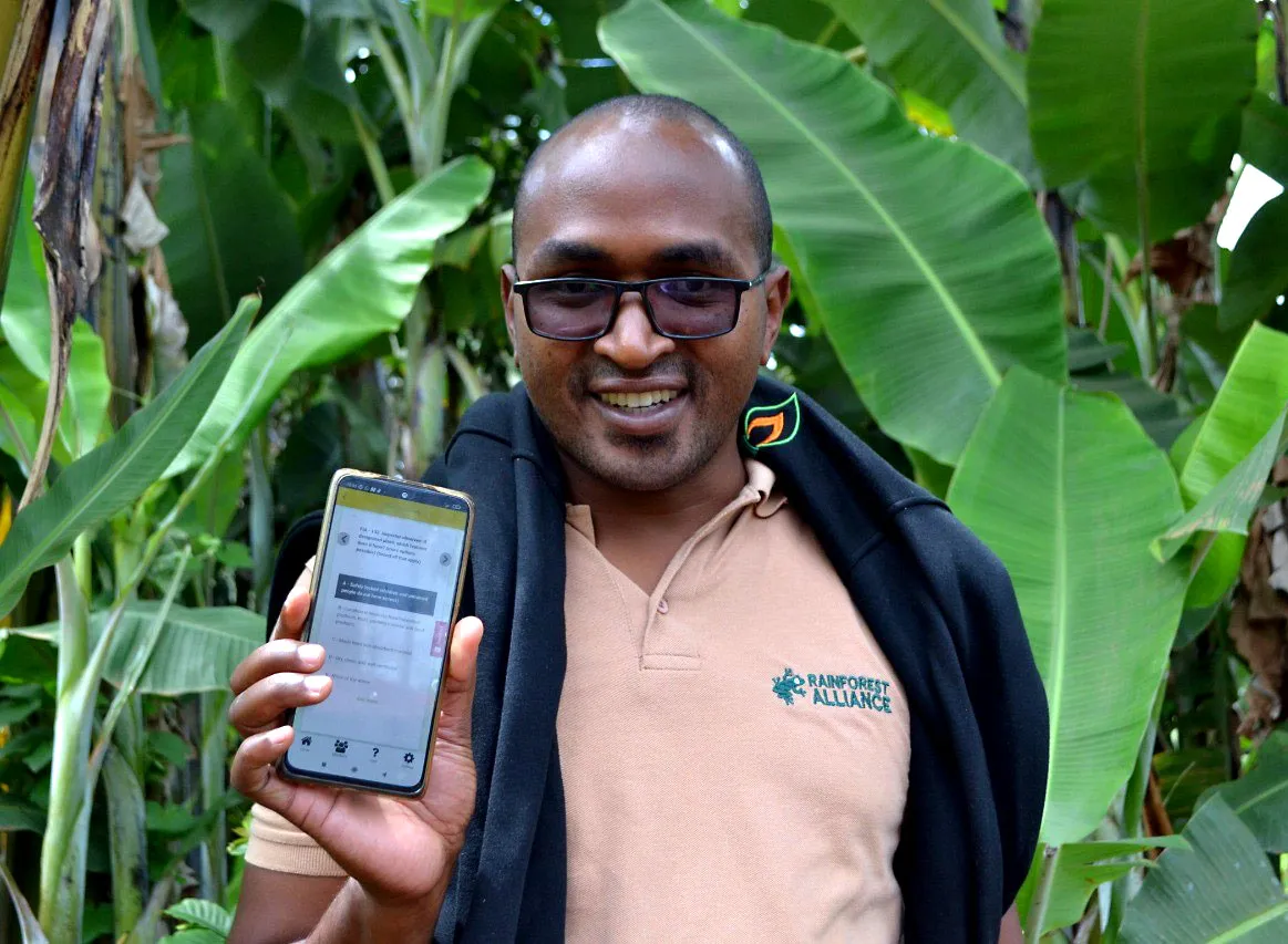 Ask Mark Njeru, the Rainforest Alliance’s regional training manager for Africa, what he and his team do, and he will give you a perfectly precise answer: they “facilitate knowledge transfer and acquisition.” Although based in Nairobi, Njeru coordinates our training work across Africa. Instead of talking down to farmers, he works with smallholder groups to help them integrate new knowledge on their farms—“to change their practices and also change their attitudes.”