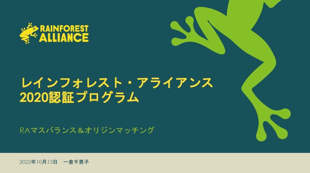 2022日10月13日に実施しました、レインフォレスト・アライアンス RAマスバランス&オリジンマッチングに関する説明会の録画並びに資料です。 レインフォレスト・アライアンス認証における、カカオにおけるマスバランス、およびオリジンマッチングの考え方について、Q&A形式でご理解いただくトレーニングです。 レインフォレスト・アライアンス 2020認証プログラム 当日の資料