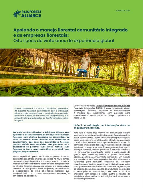 Nossa experiência inicial no apoio a empreendimentos florestais comunitários estabelecidos na Mesoamérica há muito embasa nossa estratégia florestal em outras partes do mundo. À medida que nosso trabalho se expandiu para regiões onde os direitos florestais são menos seguros e a silvicultura comunitária é uma prática mais incipiente, reconhecemos a necessidade de uma abordagem holística que se alinhe ao nosso compromisso com a ação em escala de paisagem. Nosso caminho resultante para o Manejo Florestal Comunitário Integrado (ICFM) é uma articulação dessa abordagem holística, inclusiva e baseada no contexto. À medida que trabalhamos com parceiros para operacionalizar nossa visão no campo, o momento é propício para uma análise da experiência passada com manejo florestal comunitário e desenvolvimento empresarial apoiado pela Rainforest Alliance, com o objetivo de aprender lições que possam informar os esforços do ICFM no futuro. Este documento de resumo descreve oito principais lições aprendidas.