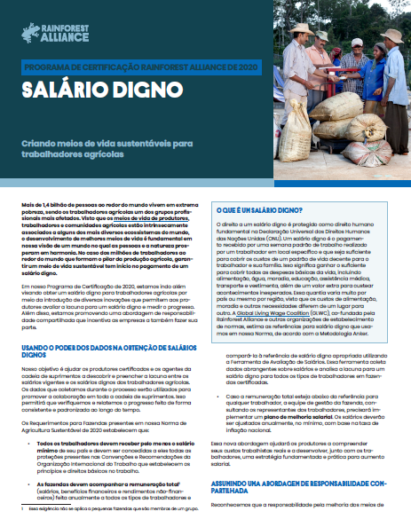 Usamos o termo “renda digna’” para nos referir a donos de fazendas que operam seus próprios negócios, mas usamos um modelo similar para olhar os salários recebidos por aqueles contratados para trabalhar em fazendas: “Salário Digno”. A Rainforest Alliance é cofundadora e co-presidente da Coalizão Global para Salário Digno, que está trabalhando ativamente para melhorar os salários dos trabalhadores nas cadeias de suprimento globais através da certificação – com o objetivo de longo prazo de definir e promover um salário digno ao redor do mundo. A Coalizão Global para Salário Digno trabalha para identificar o quanto deve ser o salário digno para um trabalhador em dado setor, em certo lugar. Essas referências – todas baseadas em pesquisas rigorosas e objetivas – fornecem ativos importantes para os trabalhadores rurais ou seus representantes, uma vez que podem negociar melhores salários com seus empregadores. O progresso ativo em direção a um salário digno é um dos requisitos dentro da certificação da Rainforest Alliance. As referências ajudam auditores das fazendas certificadas a julgar se um produtor paga aos seus trabalhadores o suficiente, e, se os salários forem muito baixos, ajuda os produtores a desenvolver planos de melhoria salarial para aumentar os salários ao longo do tempo.