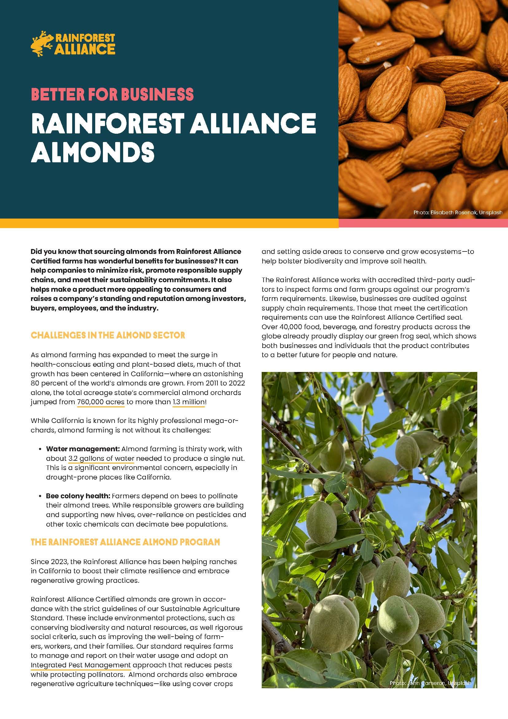 Sourcing almonds from Rainforest Alliance Certified farms has wonderful benefits for businesses. It can help companies to minimize risk, promote responsible supply chains, and meet their sustainability commitments. It also helps make a product more appealing to consumers and raises a company’s standing and reputation among investors, buyers, employees, and the industry. Since 2023, the Rainforest Alliance has been helping ranches in California to boost their climate resilience and embrace regenerative growing practices.