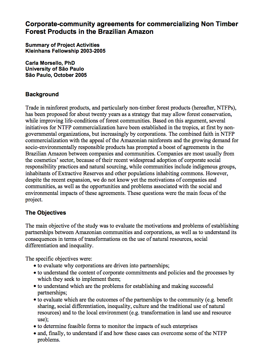 The Universidade de São Paulo in Brazil evaluated the motivations, opportunities, problems, and consequences of trade partnerships or agreements established between forest communities and corporations, for the commercialization of non-timber forest products (NTFPs).