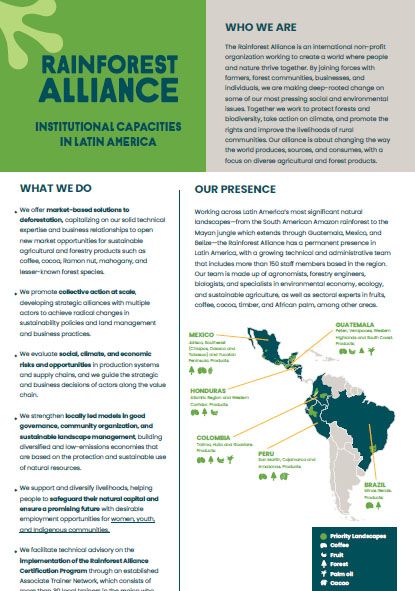 Working across Latin America’s most significant natural landscapes—from the South American Amazon rainforest to the Mayan jungle which extends through Guatemala, Mexico, and Belize—the Rainforest Alliance has a permanent presence in Latin America, with a growing technical and administrative team that includes more than 150 staff members based in the region. Learn more about how we work together in different areas and in collaboration with many actors to achieve greater impact in Latin America.