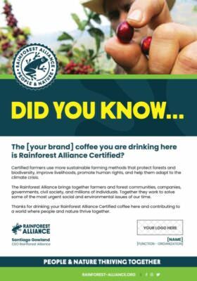 Offer your out of home customers this customizable declaration to promote your Rainforest Alliance Certified coffee and/or tea in their outlets and show their sustainability commitment to consumers. Available for coffee and tea, in multiple languages.