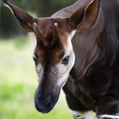 The okapi is a beautiful and elusive animal, unknown to western scientists until 1900! Standing five feet (1.5 m) tall, its legs and hindquarters are covered in black and white stripes, similar to a zebra. Its closest living relative, however, is the giraffe. Like its giraffe cousin, the okapi has a long, dark, prehensile tongue that allows it to easily strip buds and leaves off branches, excellent hearing and a similarly shaped triangular head. The okapi’s body is covered in dark reddish brown fur that is thick and velvety but very oily, helping to keep the animal dry on rainy days. Although it generally travels alone, scent glands on the bottom of its feet allow it to keep track of its okapi neighbors and mark its territory.