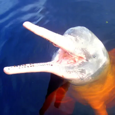 The Amazon River dolphin averages about 6.5 feet in length. They come in all shades of pink, from a dull gray-pink, to rosy colored pink, to a bright pink like that of the flamingo. This color variation is due to the clarity of the water in which the dolphin lives; the darker the water, the pinker the dolphin will be. The sun’s rays cause the dolphins to lose their pink pigmentation. Murky water helps to protect the dolphin’s bright hue. These animals are also known to flush to a bright pink when excited.