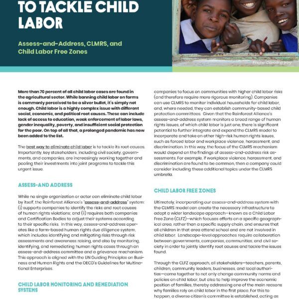 Rainforest Alliance cũng giúp các nông dân qui mô nhỏ tăng cường kỹ năng quản lý trang trại và các thực hành kinh doanh để cải thiện thu nhập hộ gia đình. Một phần quan trọng trong đó, đối với Rainforest Alliance, là đưa người phụ nữ góp phần vào việc cân bằng giới: Các chuyên gia nói rằng phụ nữ, chiếm 60% lực lượng lao động trong nông nghiệp ở các nước đang phát triển, có vai trò chủ đạo đối với an ninh lương thực và cuộc chiến chống biến đổi khí hậu. Cuối cùng, chúng tôi nhận ra tất cả các tác nhân trong chuỗi cung ứng cần phải chia sẻ trách nhiệm để góp phần cải thiện sinh kế, từ đó các rủi ro, chi phí và gánh nặng từ việc sản xuất bền vững không chỉ thuộc về người nông dân.